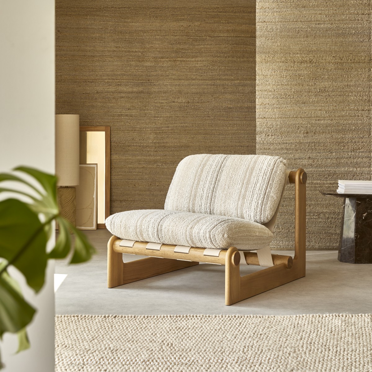 XL-Sessel aus massiver Eiche und beigem Stoff