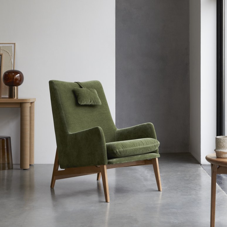 Sessel mit massivem Eichenholzgestell und braunem Stoffbezug